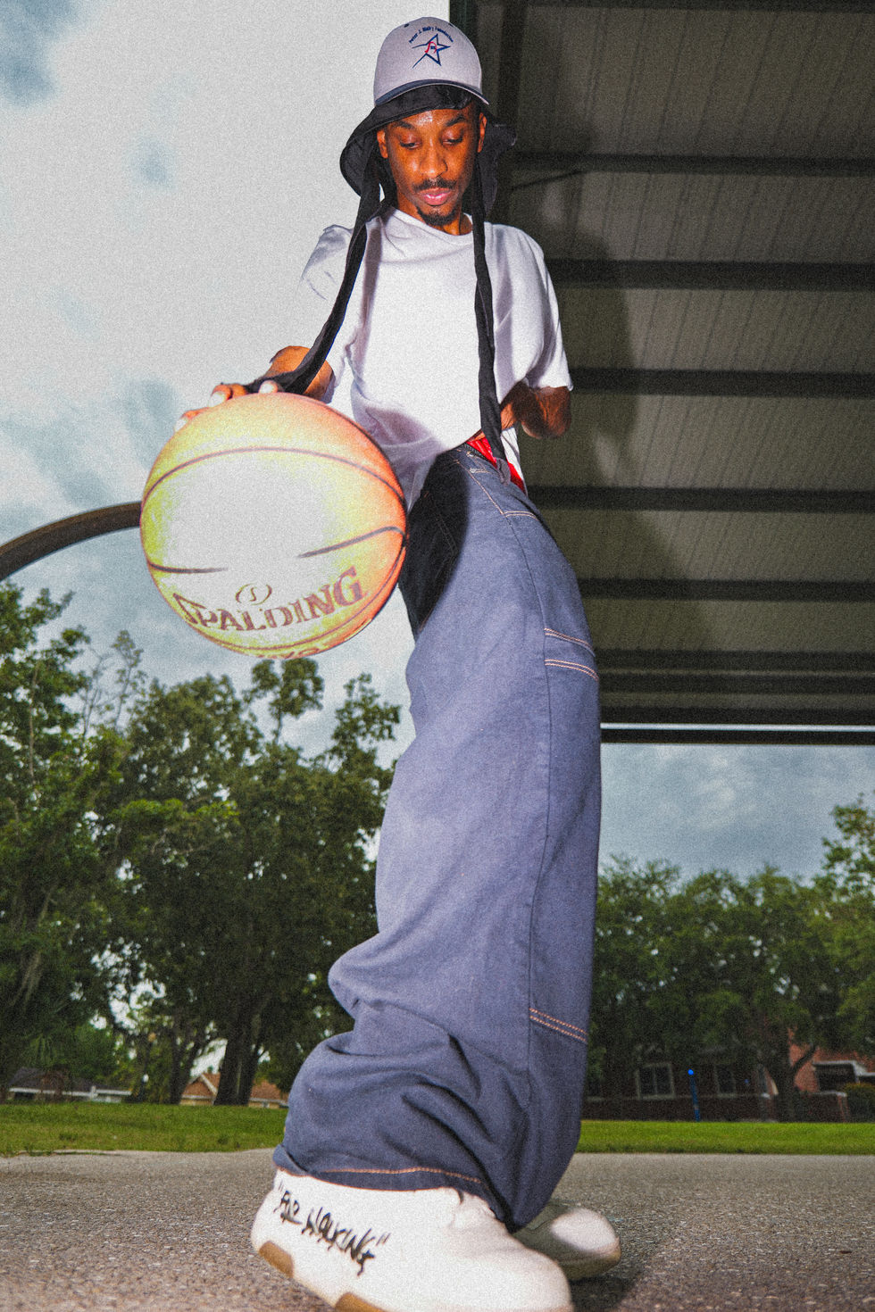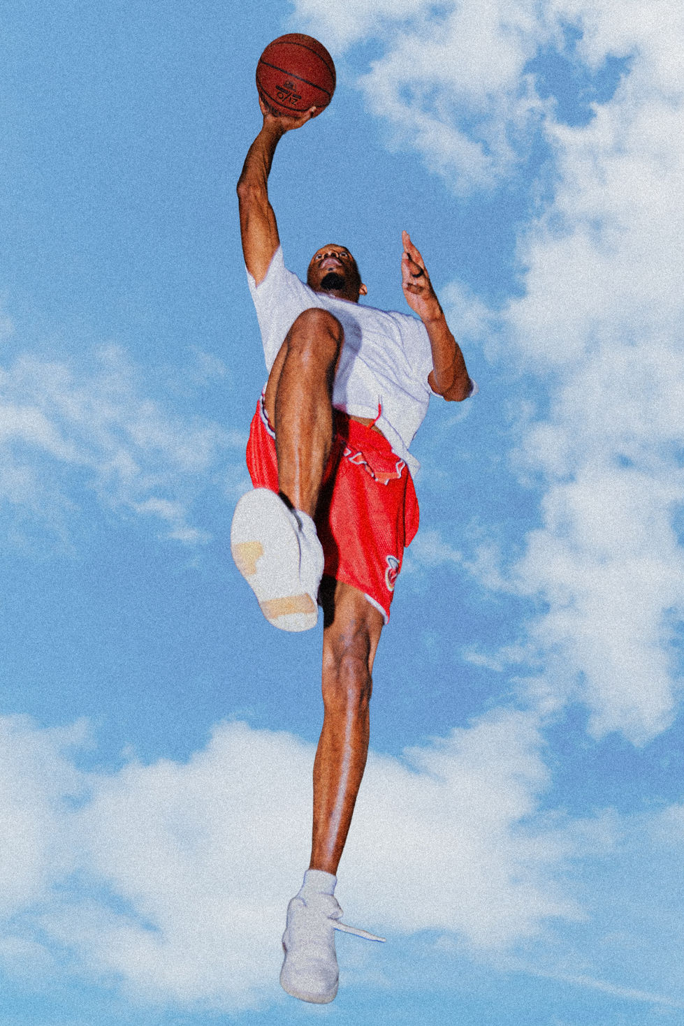 A collection of images showcasing outdoor basketball activities, including shooting, dunking, and posing on the court.